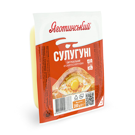 Сир розсільний «Сулугуні» 45% жиру ТМ «Яготинський» виготовляється із незбираного коров’ячого молока із додаванням молочнокислих бактерій та молокозгортуючого ферменту мікробіального походження. В цьому сирі немає рослинних жирів, антибіотиків та інших шкідливих для здоров’я сполук. Смак і запах — чистий кисломолочний, помірно солоний. Консистенція — щільна, злегка слоїста, еластична.