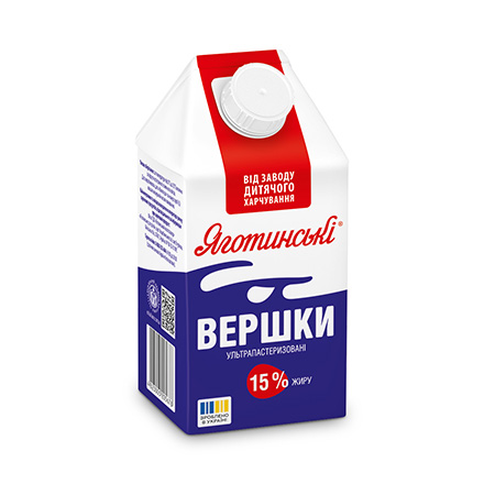 Ультрапастеризовані вершки жирністю 15% ТМ «Яготинські» виготовляються виключно з високоякісного молока екстра класу на найсучаснішому заводі дитячого молочного харчування в Україні — філії ТДВ «Яготинський маслозавод» «Яготинське для дітей».